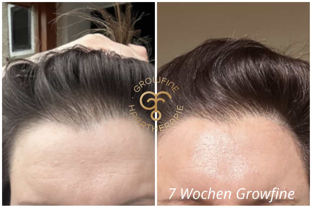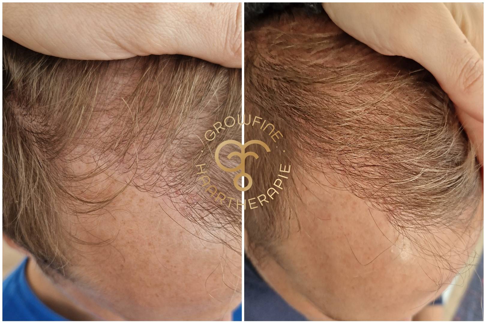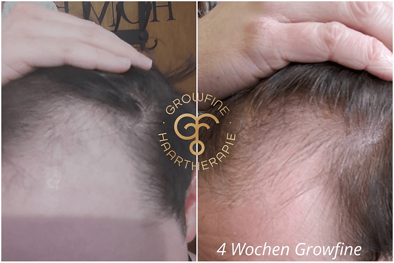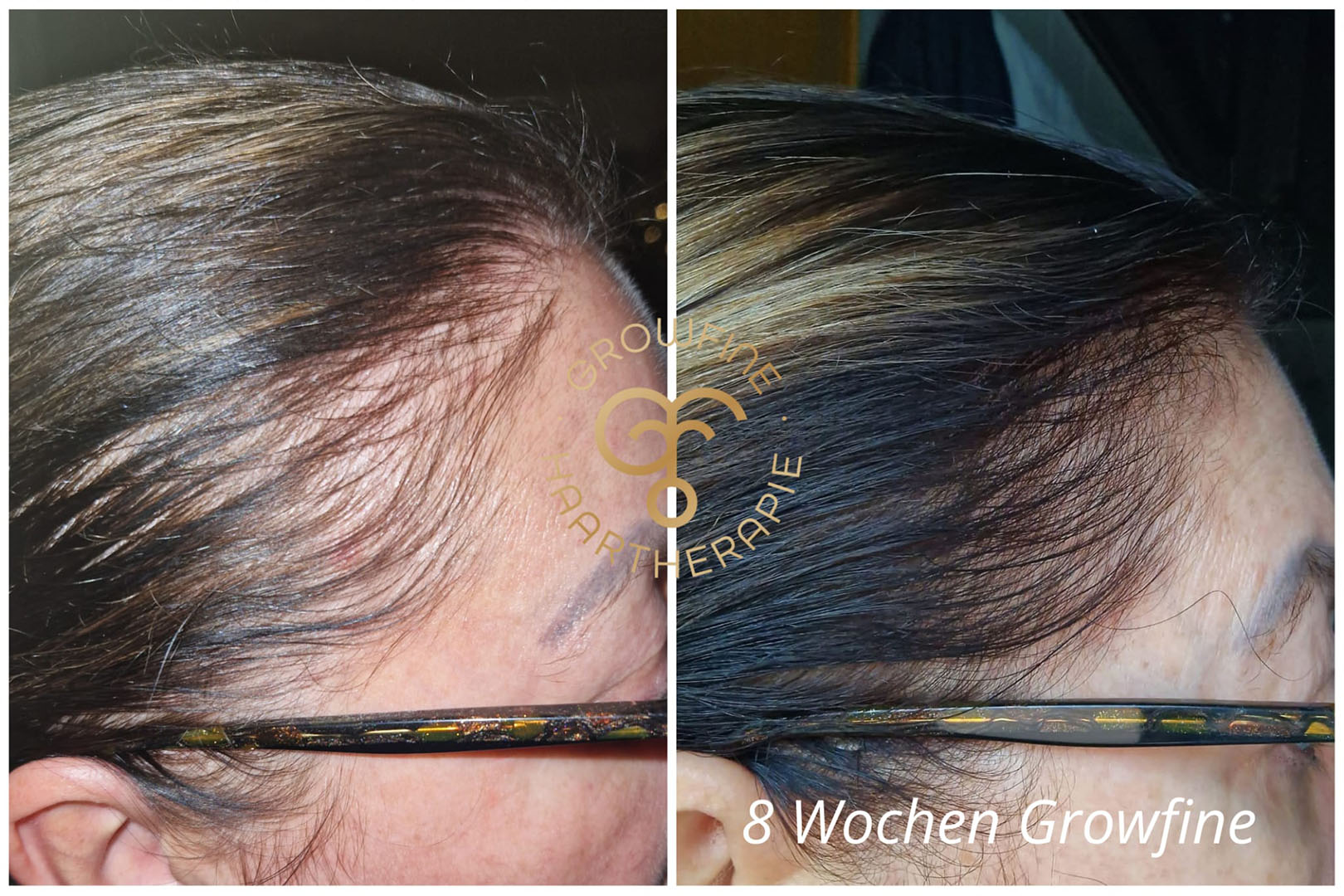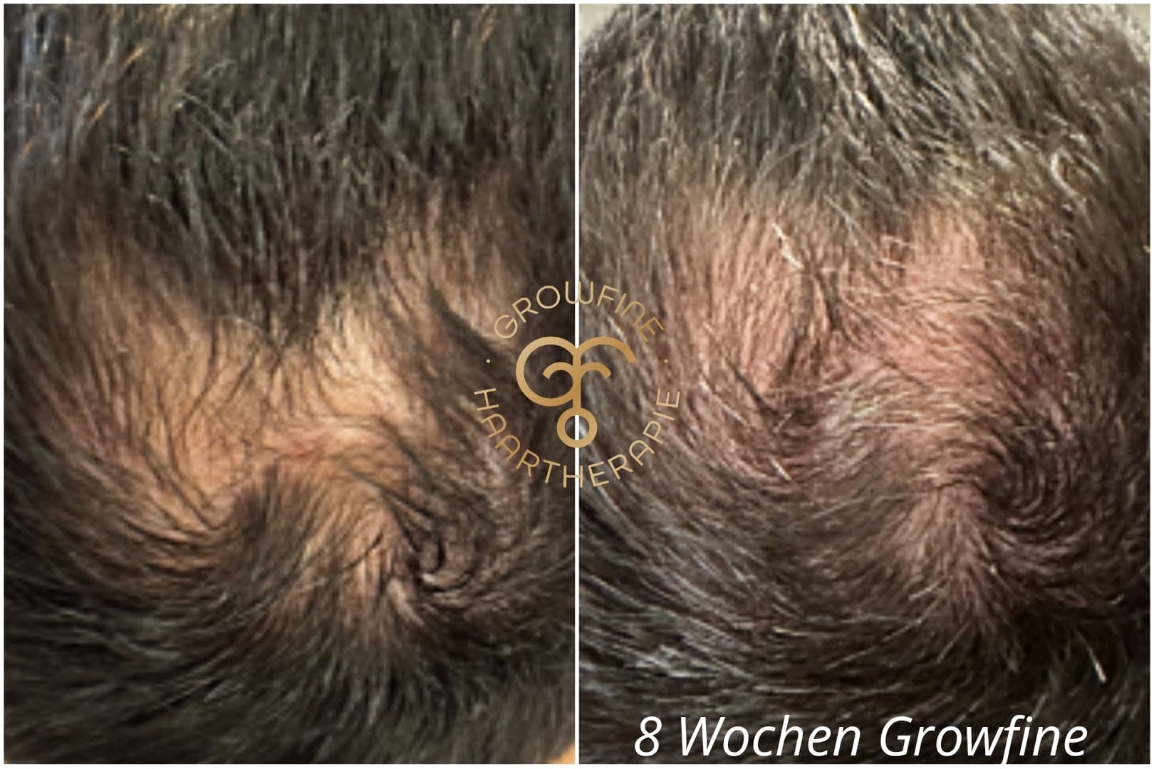 "Mein Wirbel wächst nach 8 Wochen Growfine wieder zu, womit ich in meinem Alter nicht mehr gerechnet hatte. Das Haar fühlt sich beim Duschen schon etwas kräftiger und voller an und am meisten freut mich, dass sich kleine Lücken Stück für Stück füllen."
