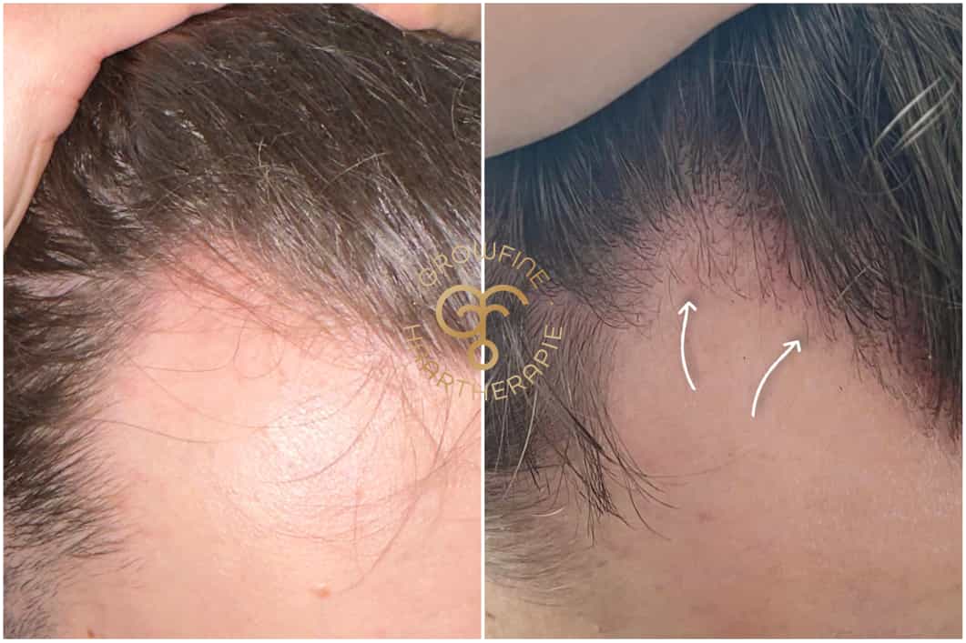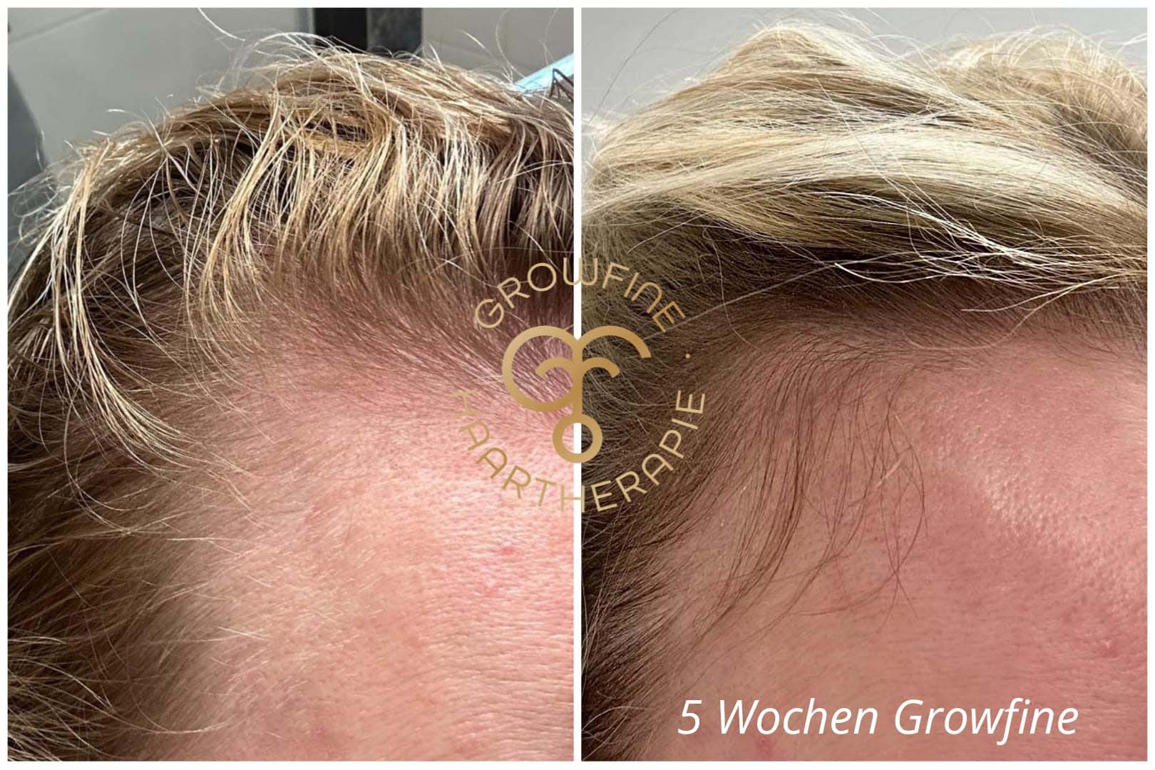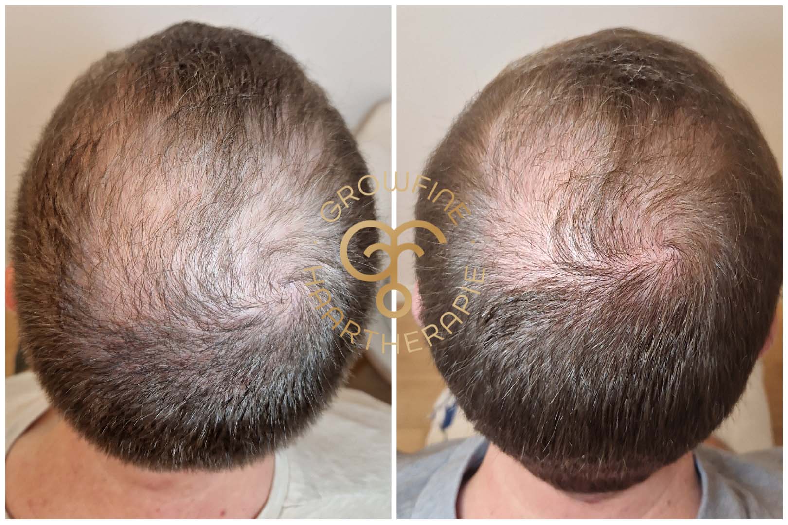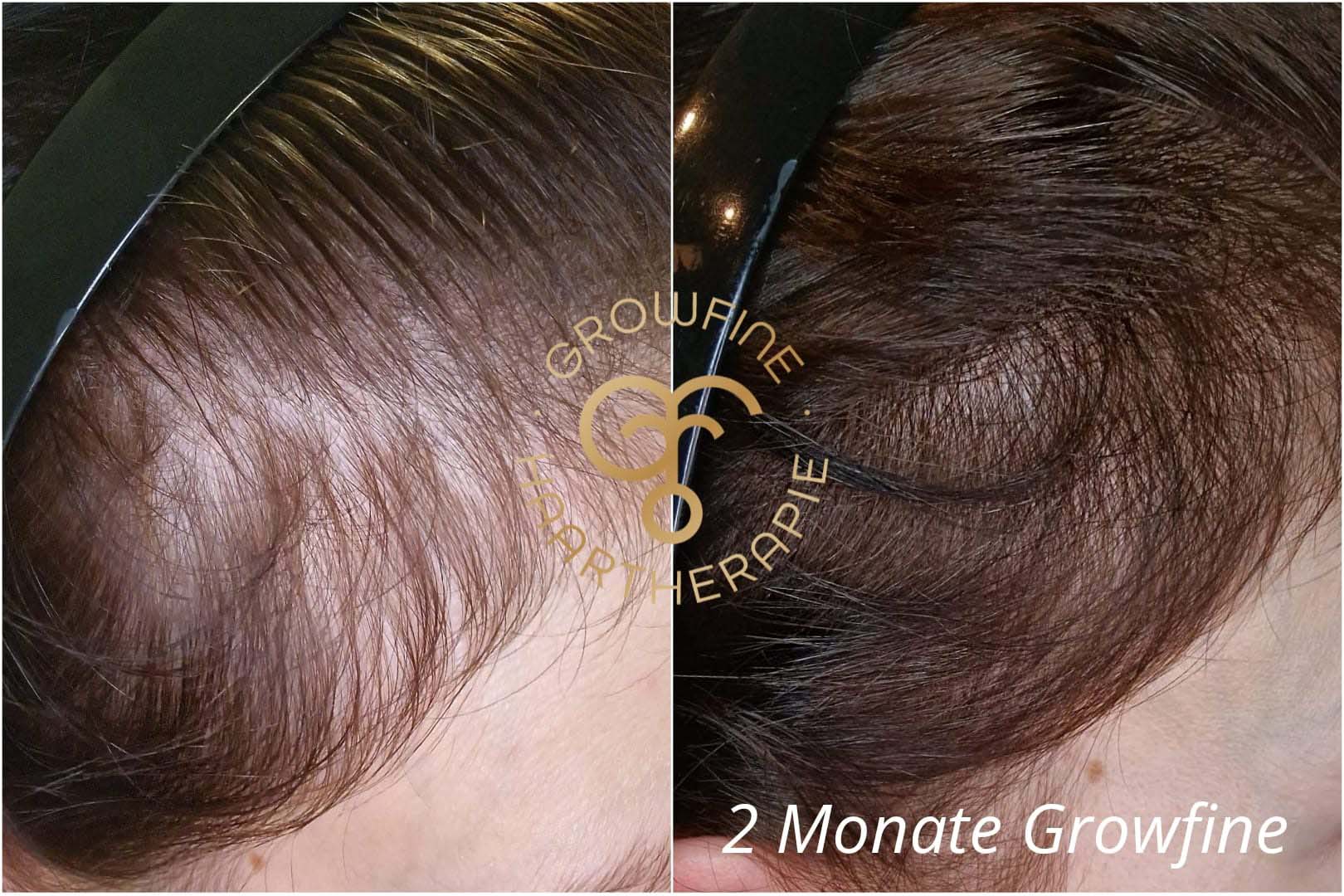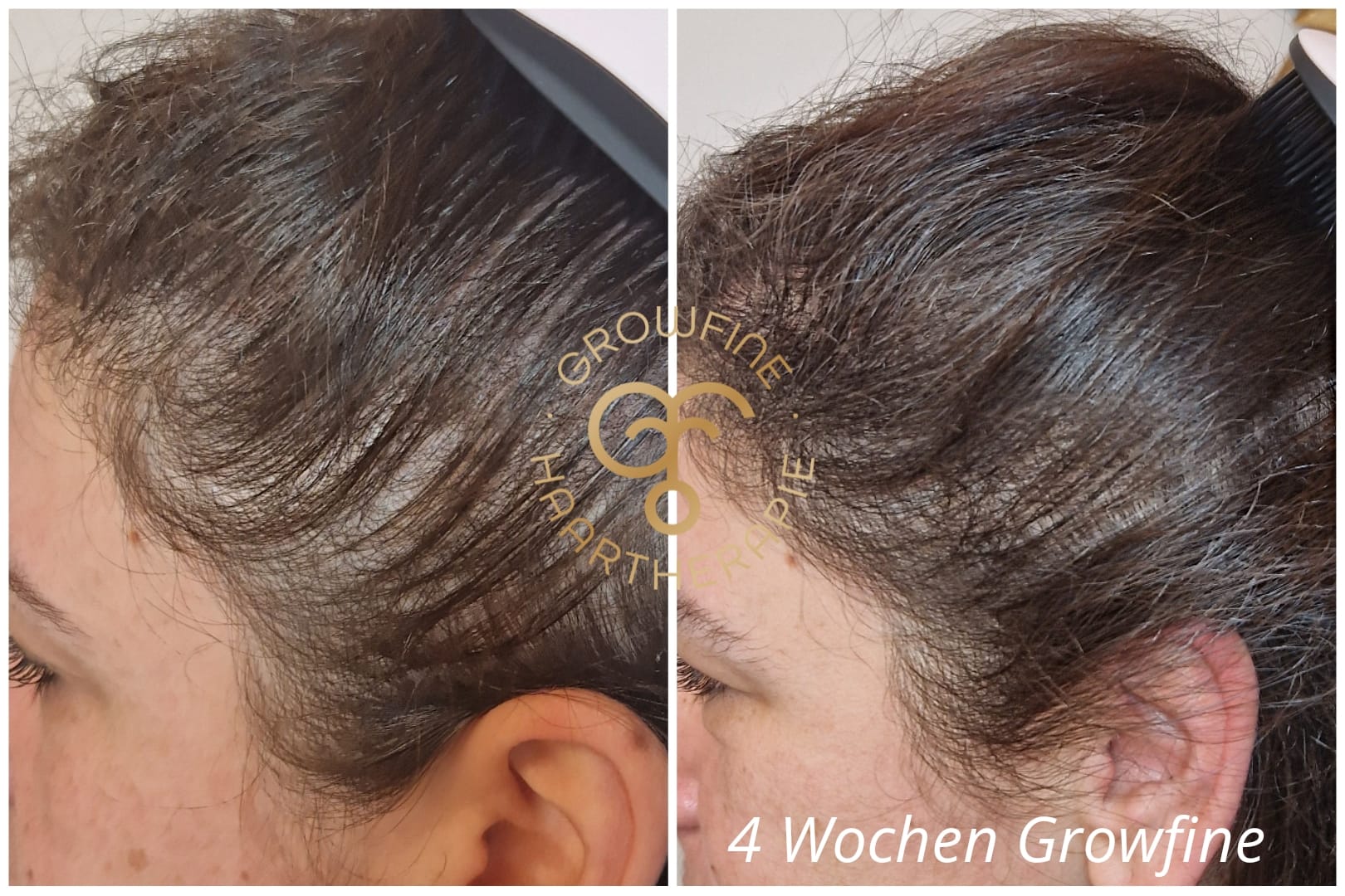 "Mein Wirbel wächst nach 8 Wochen Growfine wieder zu, womit ich in meinem Alter nicht mehr gerechnet hatte. Das Haar fühlt sich beim Duschen schon etwas kräftiger und voller an und am meisten freut mich, dass sich kleine Lücken Stück für Stück füllen."