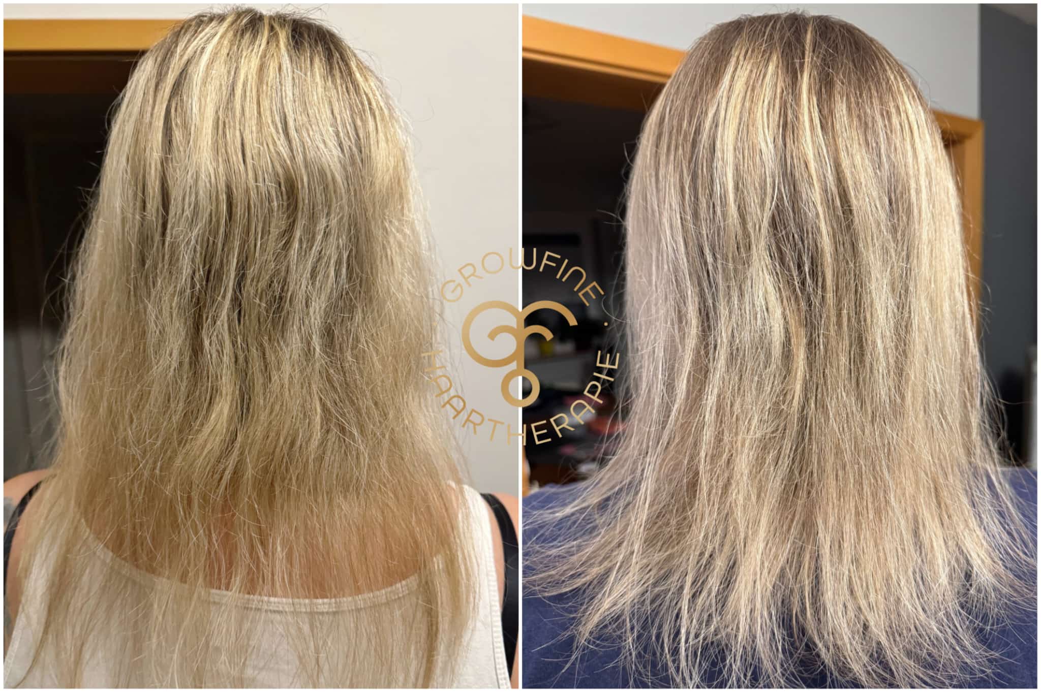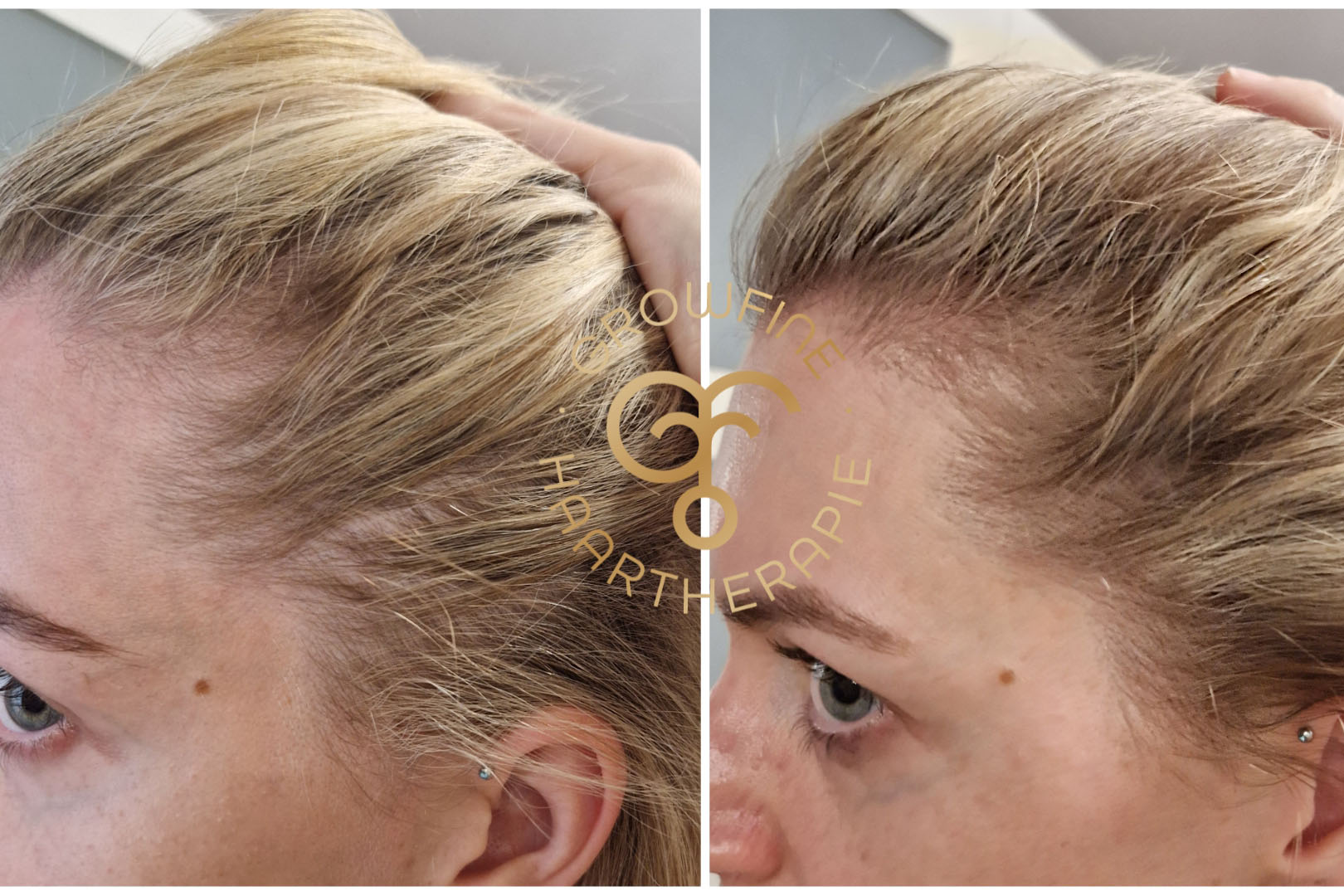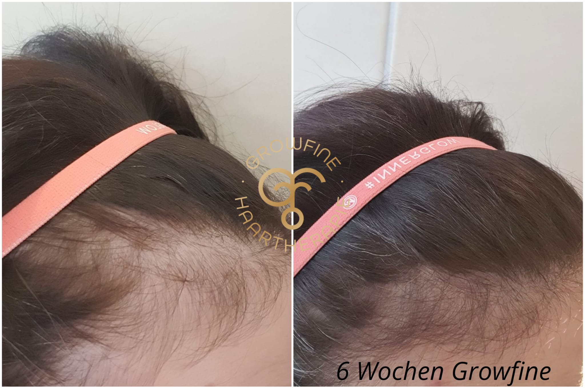 "Ich war sehr gespannt auf die Growfine Produkte und wie wirksam sie wirklich sein werden. Nach der Schwangerschaft hatte ich leider extremen Haarausfall mit stark ausgeprägten Geheimratsecken und Isabelle hat mir angeboten Ihre Produkte zu testen. Ich denke die Bilder sprechen für sich 🙂 Ich bin absolut überzeugt von den Produkten und deren Wirksamkeit. Allgemein habe ich schon nach wenigen Haarwäschen gemerkt, dass sich meine Haare dicker anfühlen. Ich habe weniger Frizz und kann endlich komplett auf meine Extensions verzichten. Zwischen den Bildern liegen in etwa 6-8 Wochen, wobei ich zwischendurch leider ein paar Wochen pausieren musste, da ich keine Produkte mehr hatte."