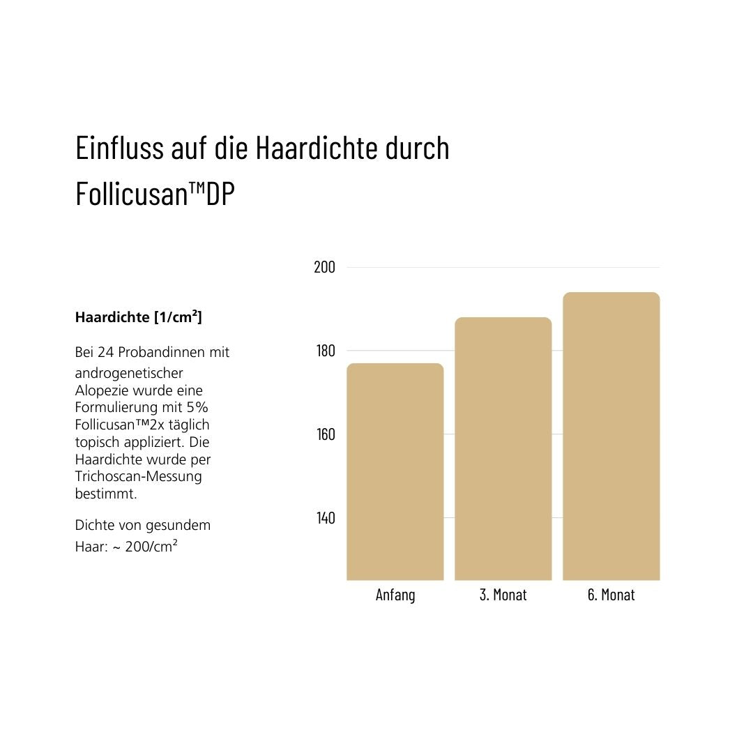 Mehr Haardichte Nachweislich mehr Haardichte: In einer dermatologischen Studie der Universität Marburg konnte Follicusan™ das Haarwachstum bei Frauen mit hormonellem & erblich bedingtem Haarausfall innerhalb von 6 Monaten sichtbar verbessern.