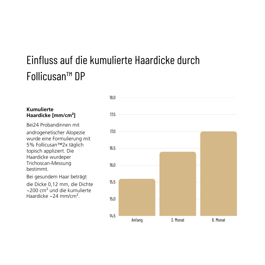 Mehr Haardicke Mehr Haardicke für sichtbar volleres Haar: Die Studie der Universität Marburg zeigte eine messbare Zunahme der kumulierten Haardicke durch Follicusan™.