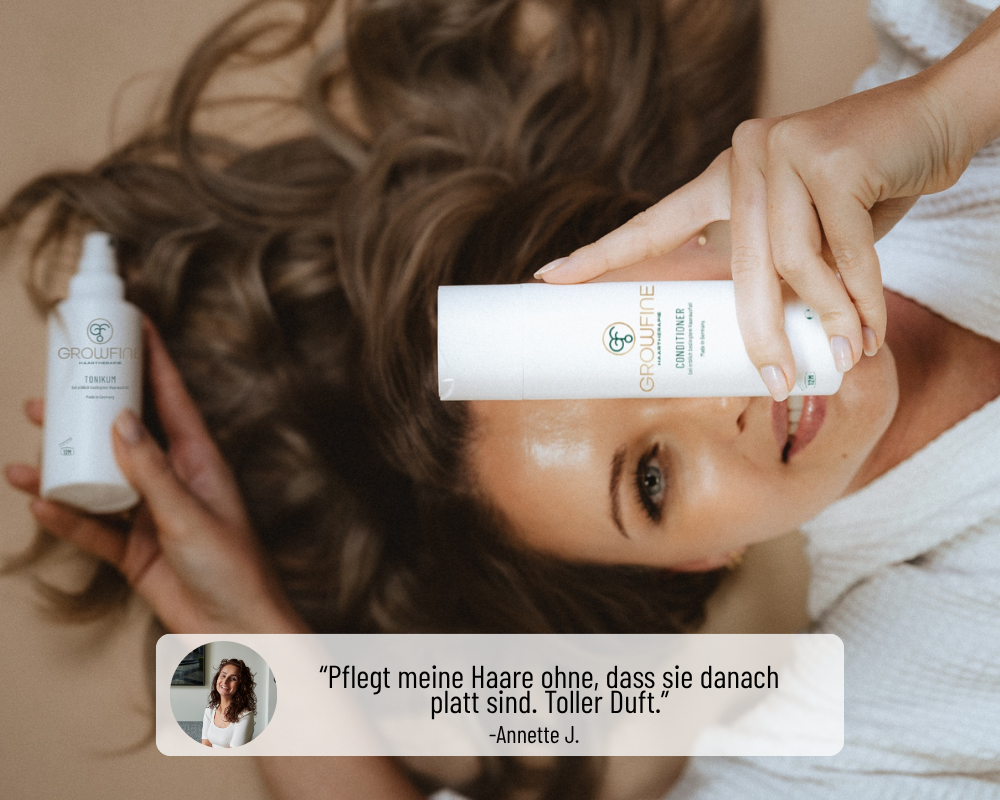 - Growfine Shampoo – Reinigt sanft und bereitet das Haar auf die Pflege mit dem Conditioner vor.