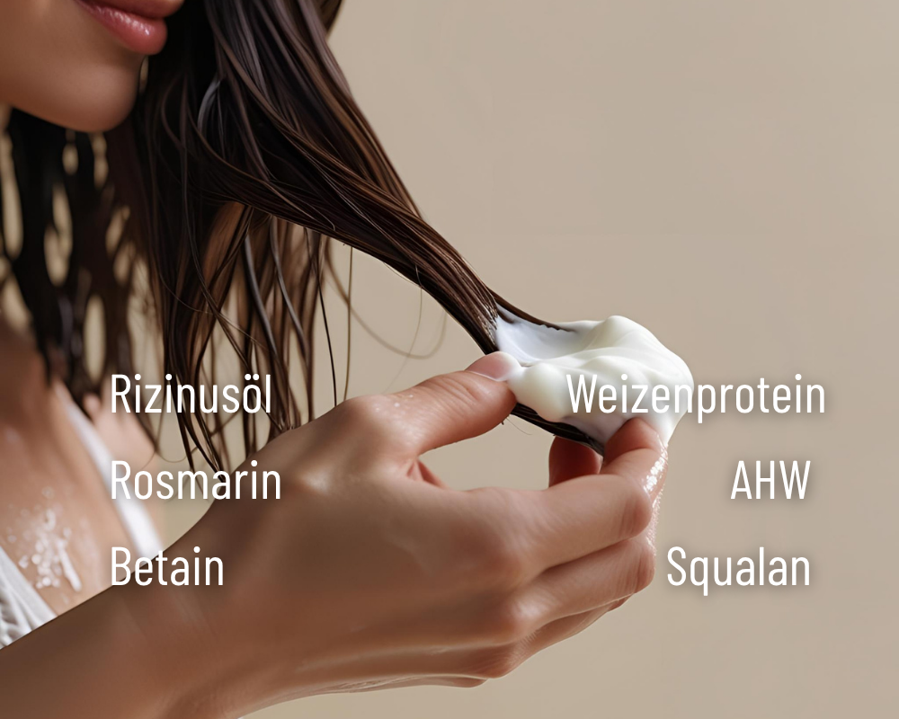 Ein spezieller Anti-Haarausfallwirkstoff vitalisiert die Kopfhaut-Zellen und wirkt vorzeitigem, beschleunigtem Haarausfall entgegen. Betain spendet Feuchtigkeit, reduziert Hautirritationen und hat antistatische Eigenschaften, was besonders für Haarpflegeprodukte vorteilhaft ist. Oliven-Squalane machen Haut und Haare weich und glatt, während Rizinusöl für zusätzlichen Glanz und bessere Kämmbarkeit sorgt. Diese Mischung von Wirkstoffen pflegt Haut und Haar, erhöht Feuchtigkeit, verbessert die Durchblutung und stärkt die Haare.