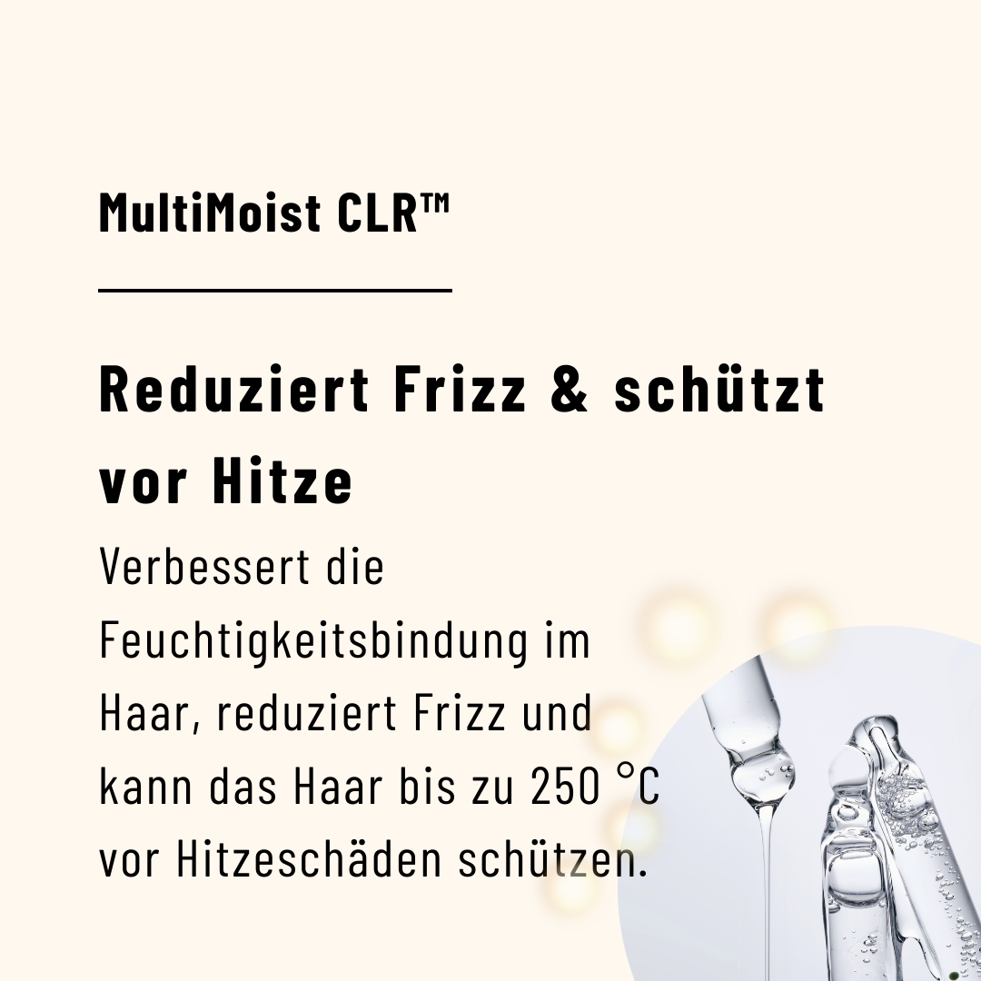 MultiMoist CLR™ – kann die Feuchtigkeitsbindung im Haar verbessern, Frizz reduzieren und das Haar bis zu 250 °C vor Hitzeschäden schützen.