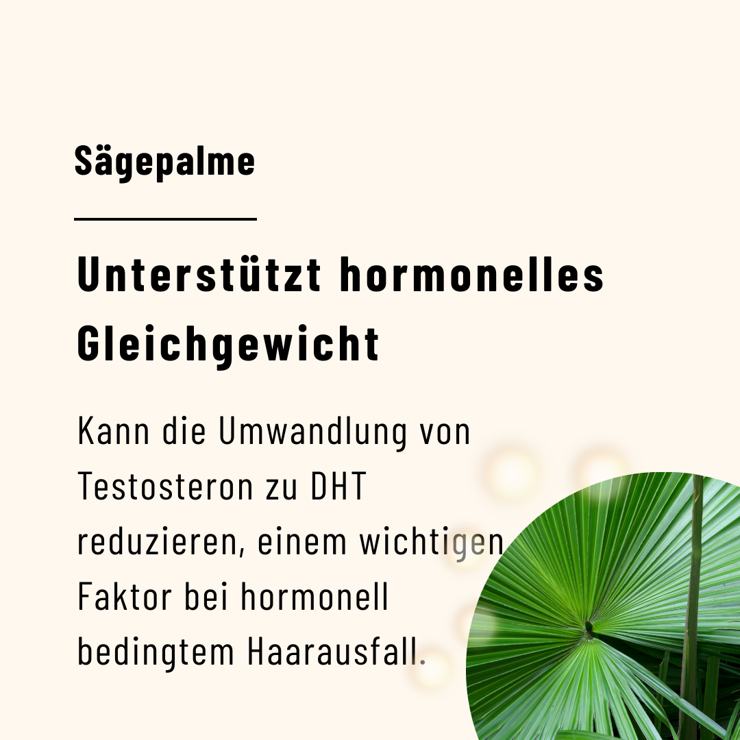 Sägepalmenextrakt (Serenoa repens) – kann die Umwandlung von Testosteron zu DHT reduzieren, einem wichtigen Faktor bei hormonell bedingtem Haarausfall.
