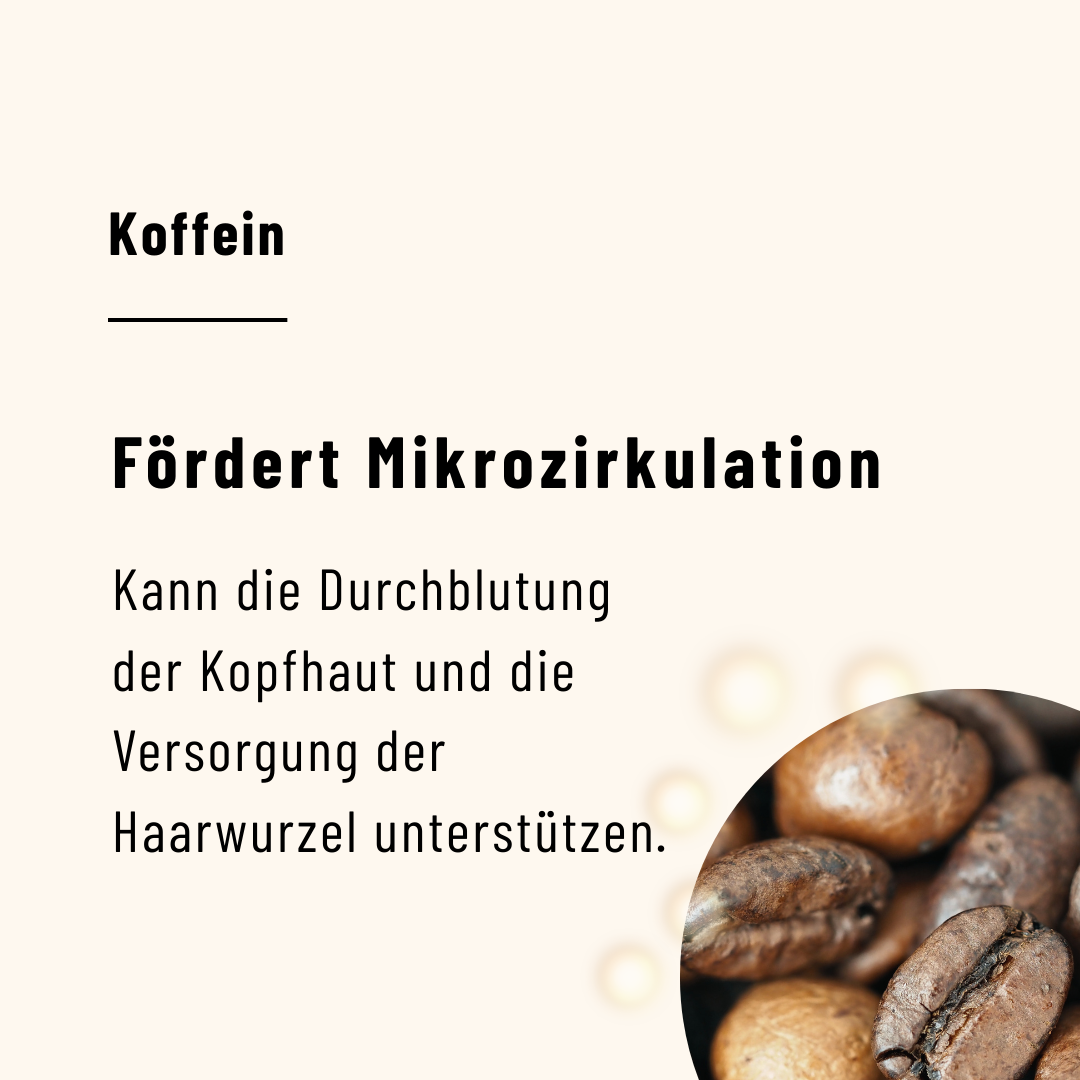 Koffein – kann die Mikrozirkulation der Kopfhaut fördern und so die Versorgung der Haarfollikel unterstützen.
